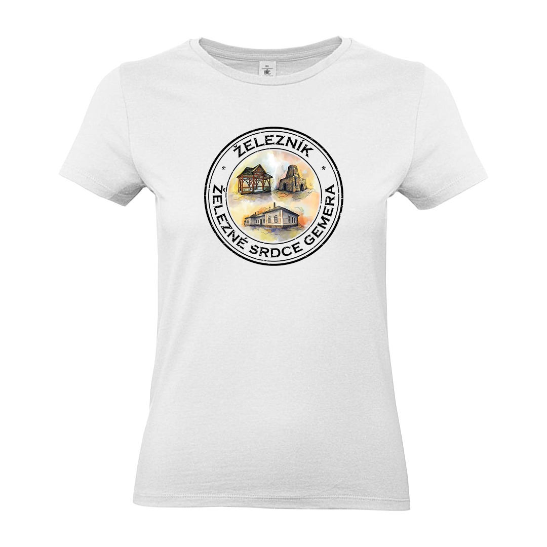 Biele tričko s potlačou pečiatky s kolážou 3 pestrofarebných obrázkov (Hudobný altánok na Kríži, Kino Stachanov na Ladislave, Vysoká pec v Červeňanoch). 100% bavlna.