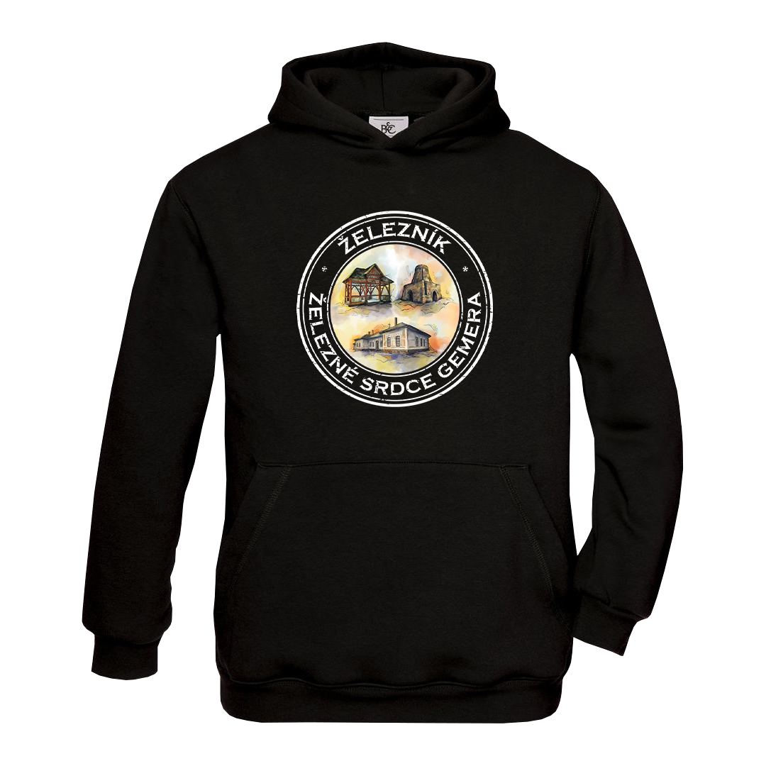 Detská mikina čierna, s potlačou pečiatky s kolážou 3 pestrofarebných obrázkov (Hudobný altánok na Kríži, Kino Stachanov na Ladislave, Vysoká pec v Červeňanoch). Má bežný strih.