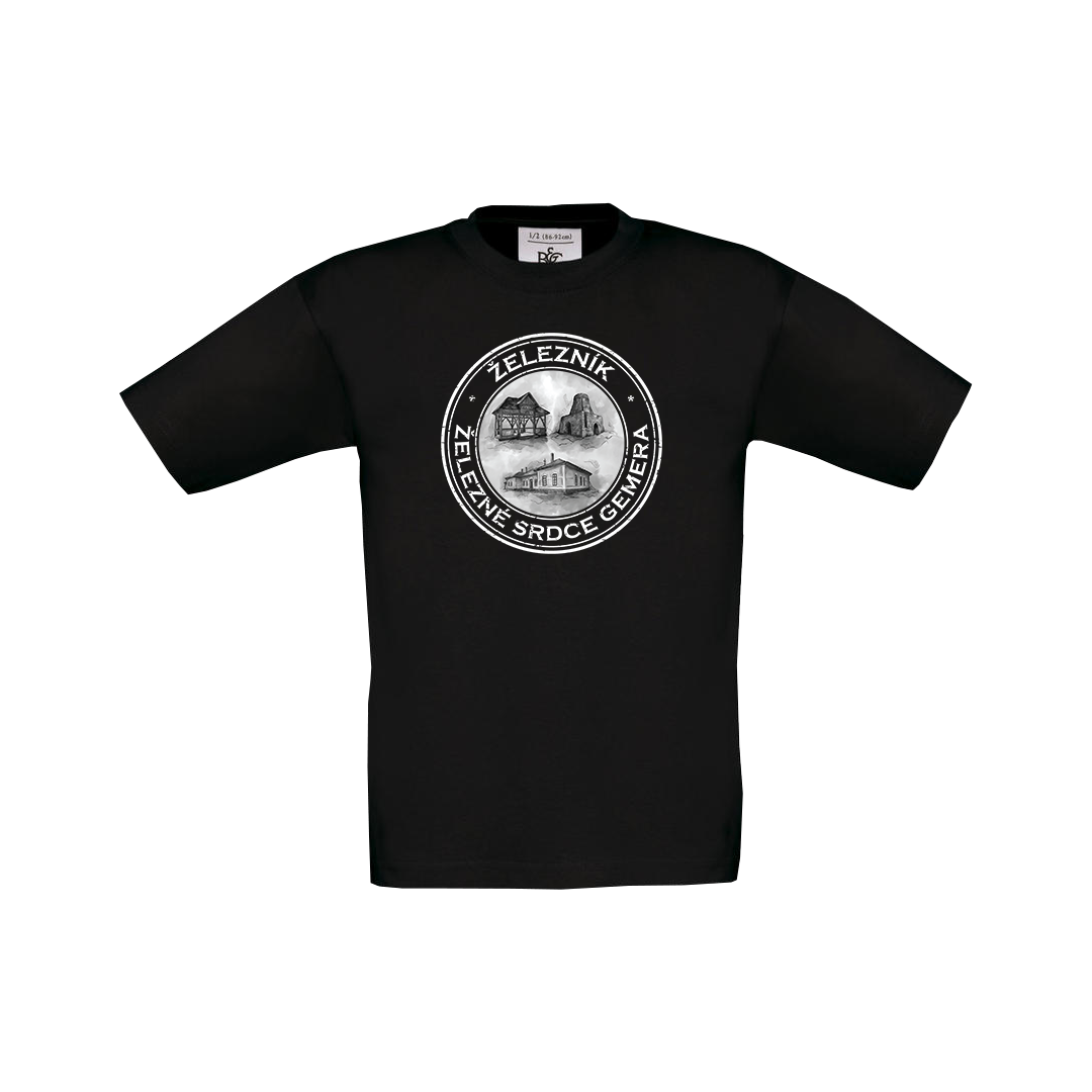Čierne tričko s potlačou pečiatky s kolážou 3 čiernobielych obrázkov (Hudobný altánok na Kríži, Kino Stachanov na Ladislave, Vysoká pec v Červeňanoch). 100% bavlna.