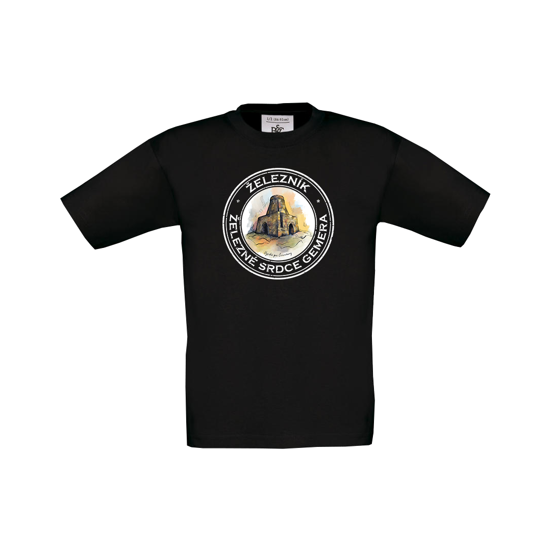 Čierne tričko s potlačou pestrofarebnej pečiatky s Vysokou pecou v Červeňanoch. 100% bavlna