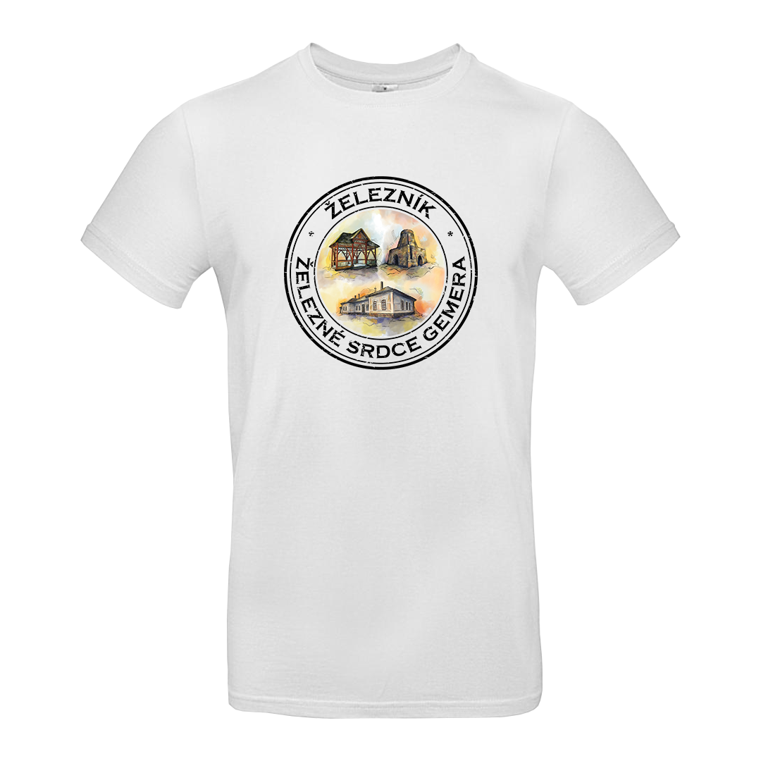 Biele tričko s potlačou pečiatky s kolážou 3 pestrofarebných obrázkov (Hudobný altánok na Kríži, Kino Stachanov na Ladislave, Vysoká pec v Červeňanoch). 100% bavlna.