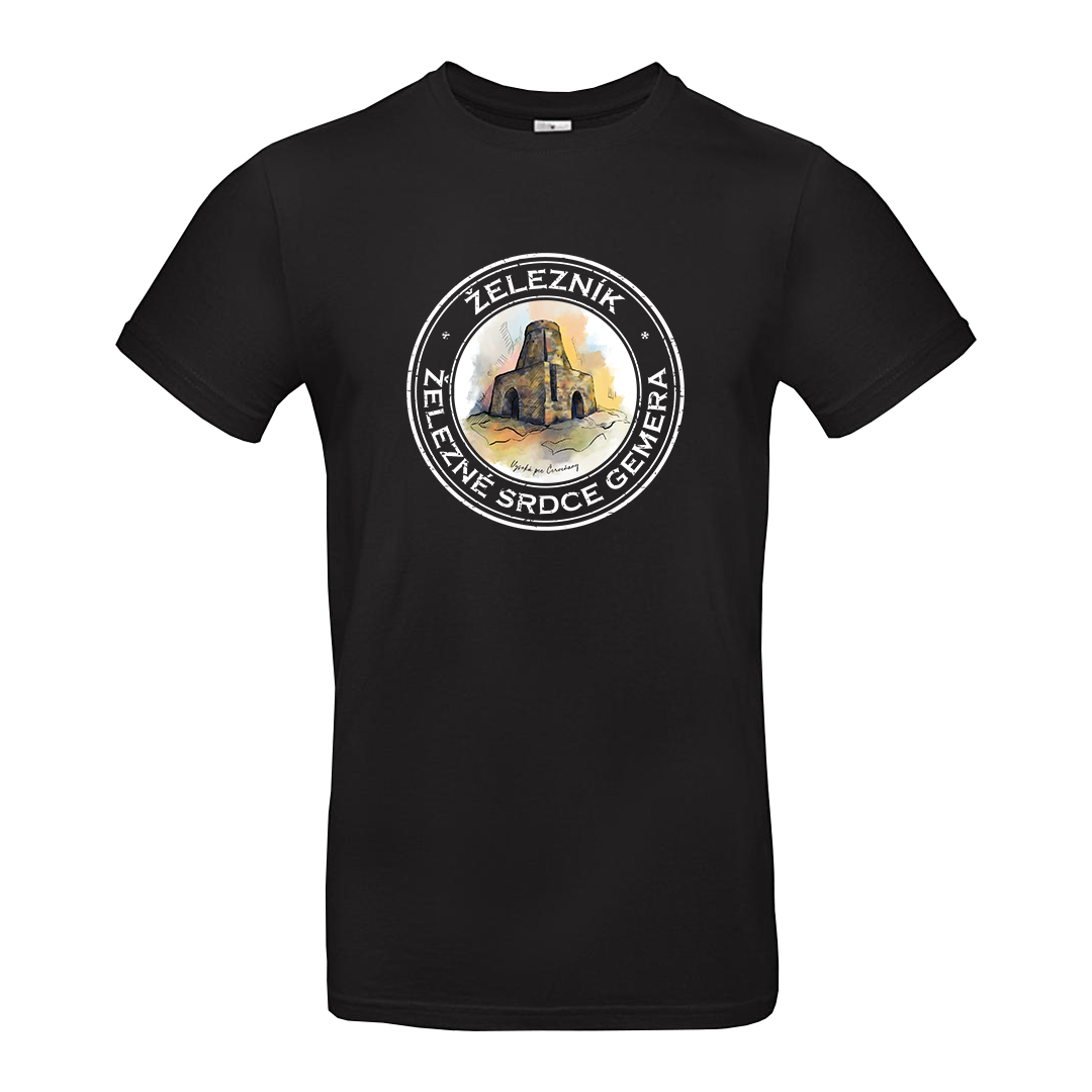 Čierne tričko s potlačou pestrofarebnej pečiatky s Vysokou pecou v Červeňanoch. 100% bavlna