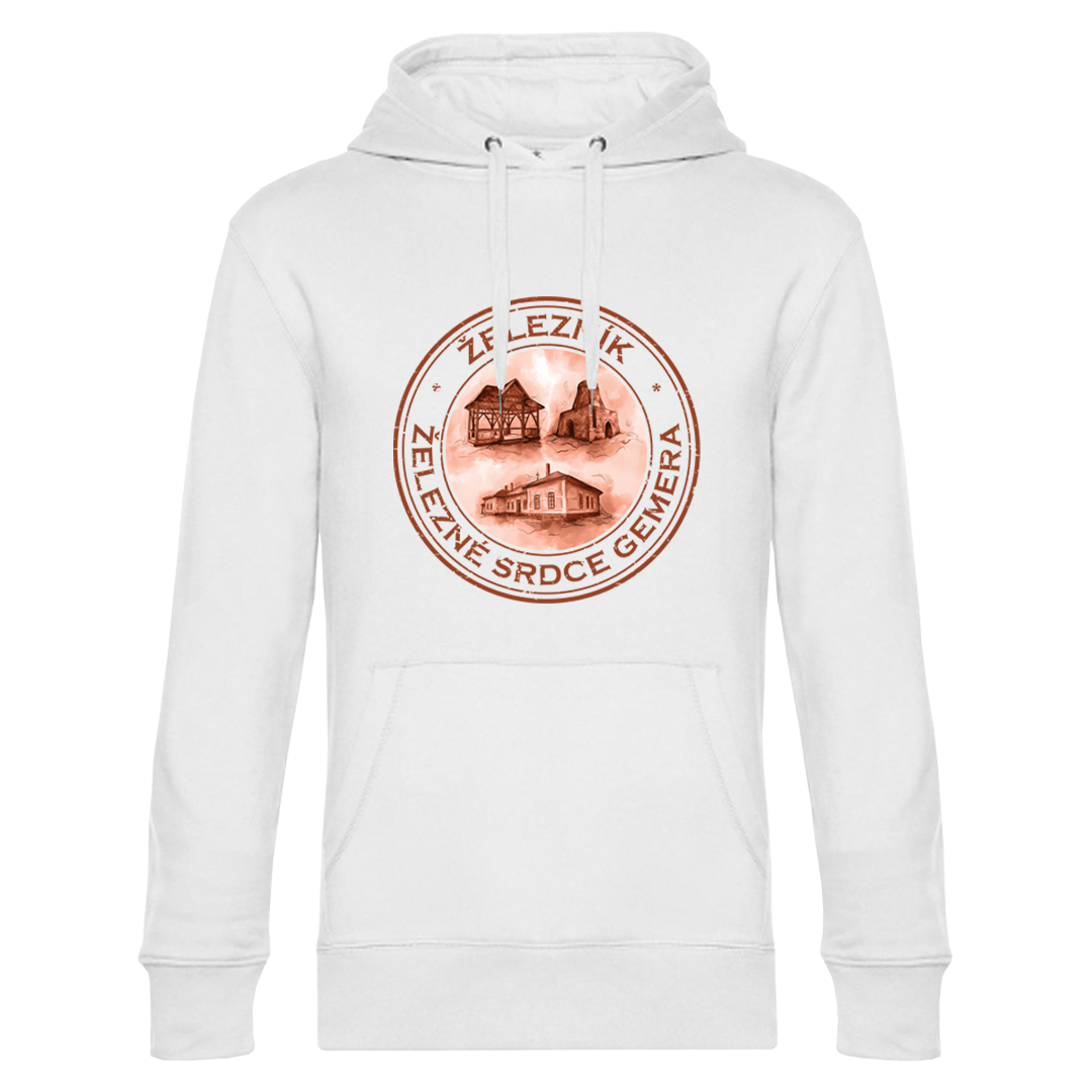 Unisex mikina biela, s potlačou pečiatky s kolážou 3 patinových obrázkov (Hudobný altánok na Kríži, Kino Stachanov na Ladislave, Vysoká pec v Červeňanoch). Má bežný strih.