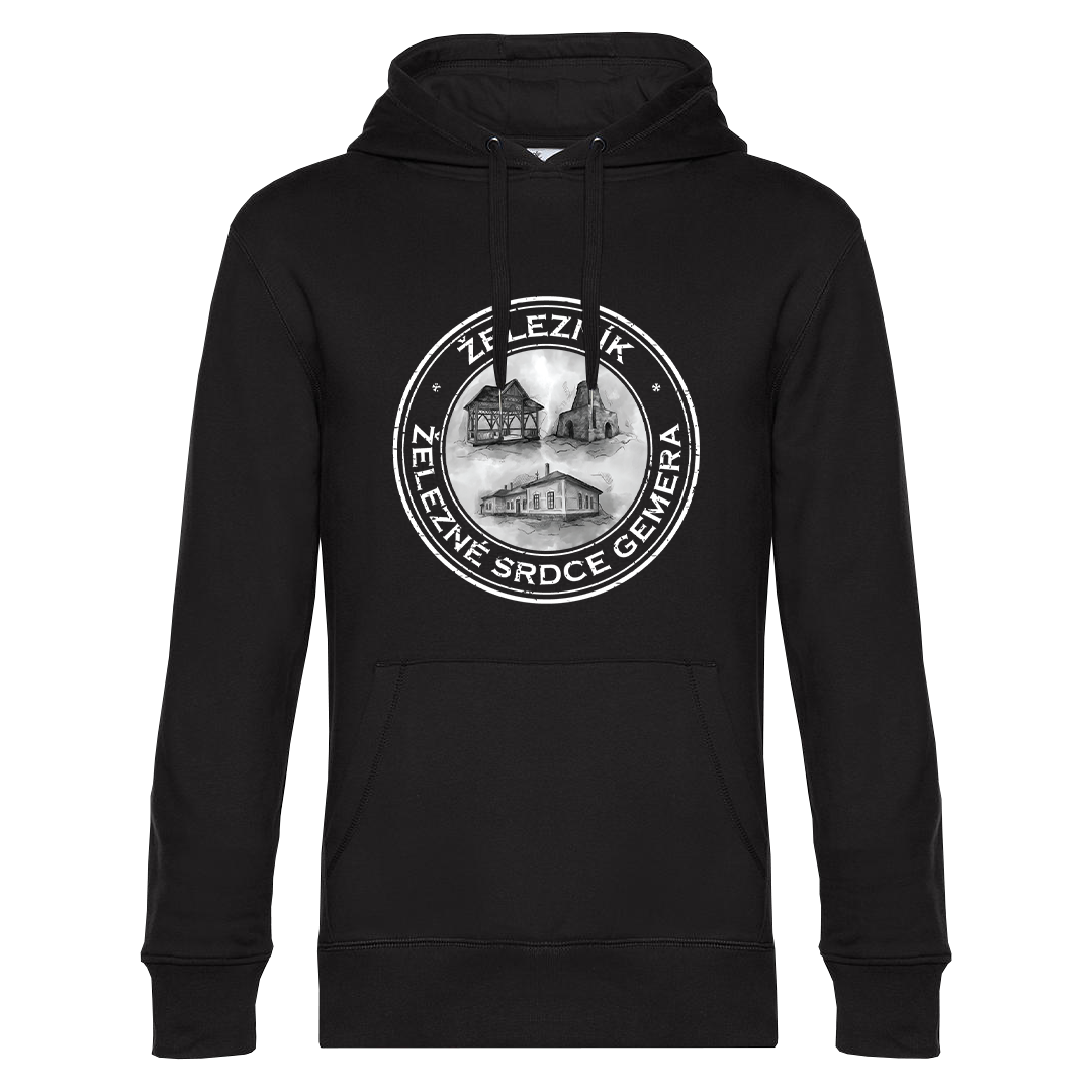 Unisex mikina čierna, s potlačou pečiatky s kolážou 3 čiernobielych obrázkov (Hudobný altánok na Kríži, Kino Stachanov na Ladislave, Vysoká pec v Červeňanoch). Má bežný strih.