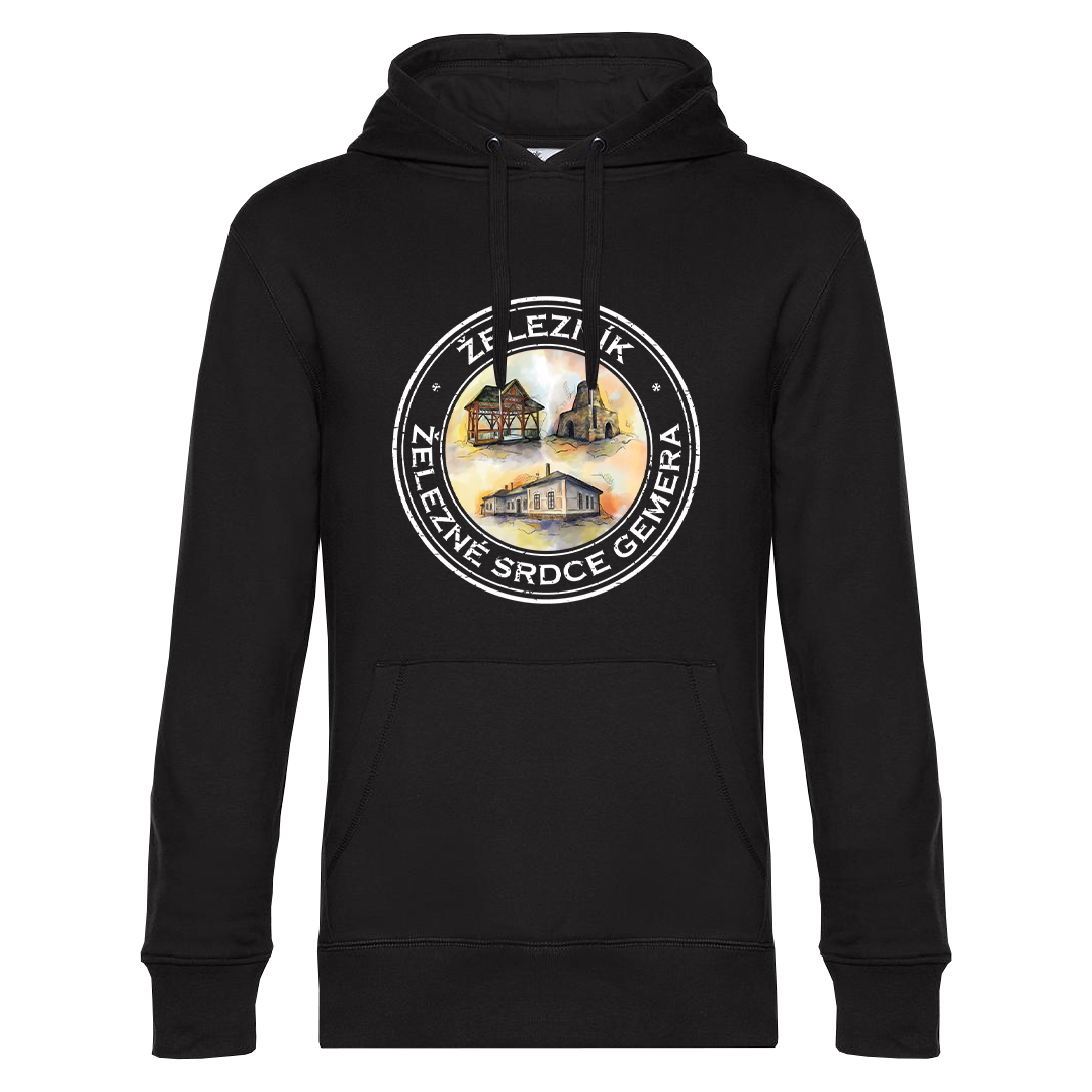 Unisex mikina čierna, s potlačou pečiatky s kolážou 3 pestrofarebných obrázkov (Hudobný altánok na Kríži, Kino Stachanov na Ladislave, Vysoká pec v Červeňanoch). Má bežný strih.